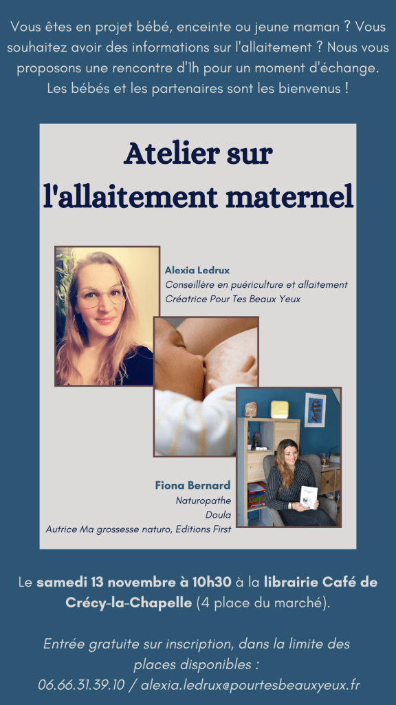 Nous vous attendons avec Alexia à la Librairie Café de Crécy La Chapelle pour un atelier gratuit sur l’allaitement. Inscription auprès d’Alexia par mail ou téléphone (voir sur l’image ci-dessus).